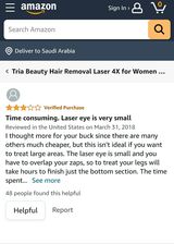 “العدسة صغيرة جدا مما يستهلك الكثير من الوقت، لقد فكرت أن هناك أجهزة أكثر وأن الأغلى أفضل، لكن هذا ليس صحيح، فالجهاز غير مناسب للمناطق الواسعة من الجسم، فجلسة الليزر للساقين يمكنها أن تستغرق ساعات طويلة، قد يناسب الوجه وتحت الإبطين أكثر”.