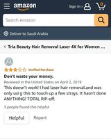 “لا تضيع مالك، هذا الجهاز لم يفعل أي شيء رغم أنه سبق لي معالجة جسمي بالليزر واشتريته لعمل بعض الرتوش فقط، ومع ذلك لم ينفع”.